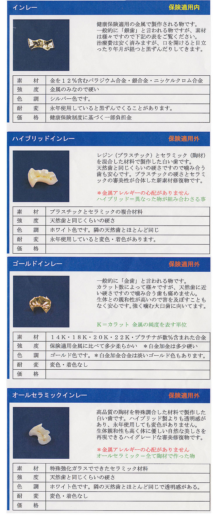 インレーとは、「詰め物」のことを表します。その中でもメタルインレーは、基本的に銀50%を含有したものが中心に使われています。このメタルインレーもメリット・デメリットがございます。